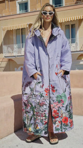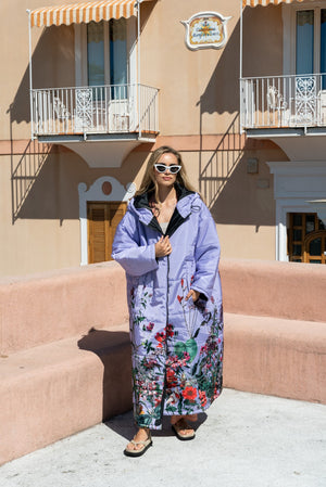 Florence Sittingsuit with wild flowers on a pastel purple background.