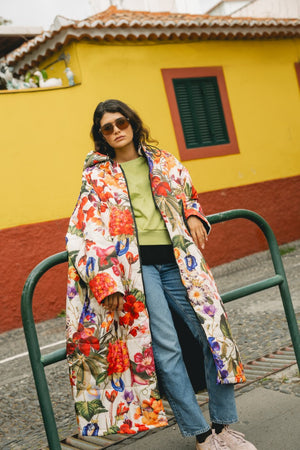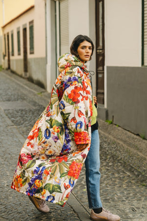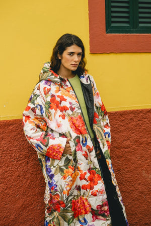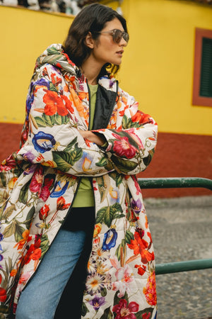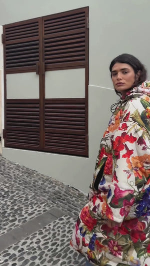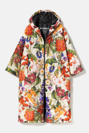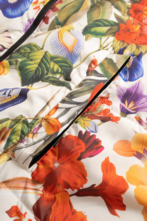 The Breeze Sittingsuit with flowers on a light background. The zipper and lining fabric are black. Unisex and one-size.
